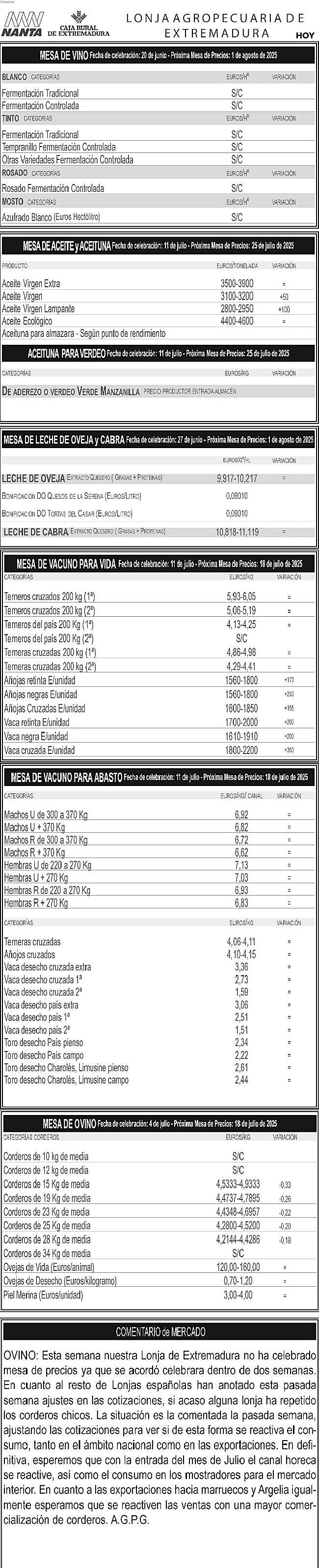 Consulte toda la información de las mesas de la lonja agropecuaria de Extremadura del jueves, 17 de julio de 2025.