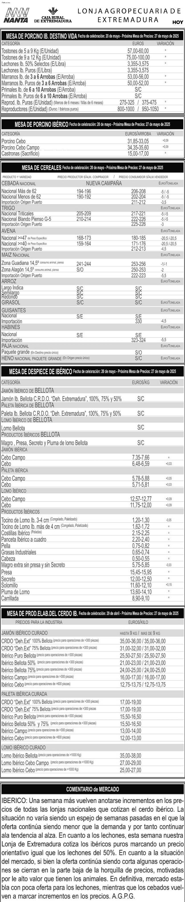 Consulte toda la información de las mesas de la lonja agropecuaria de Extremadura del jueves, 22 de mayo de 2025.