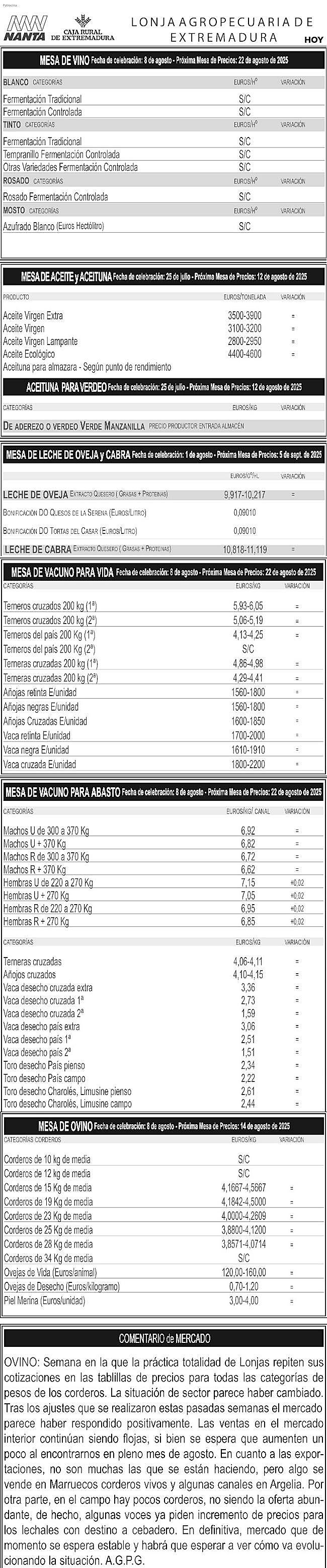 Consulte toda la información de las mesas de la lonja agropecuaria de Extremadura del martes, 12 de agosto de 2025.