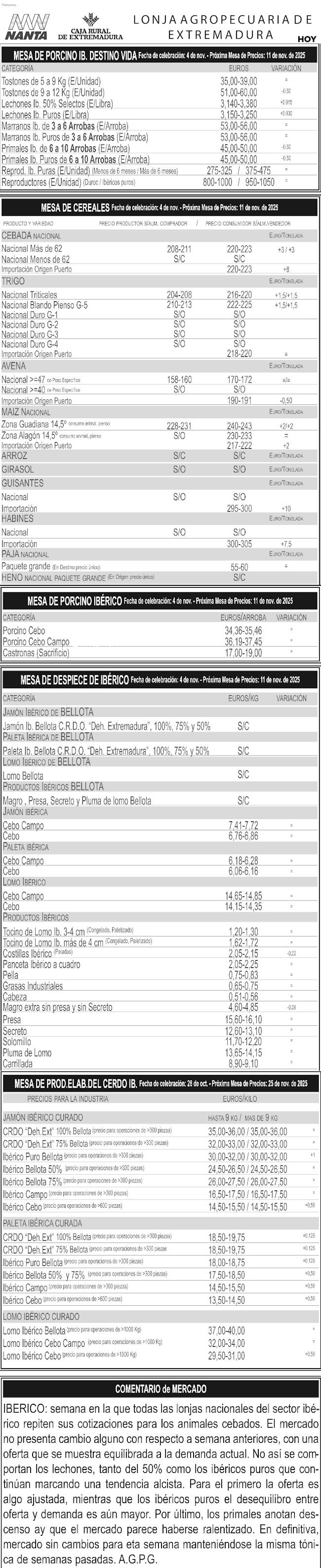 Consulte toda la información de las mesas de la lonja agropecuaria de Extremadura del jueves, 6 de noviembre de 2025.