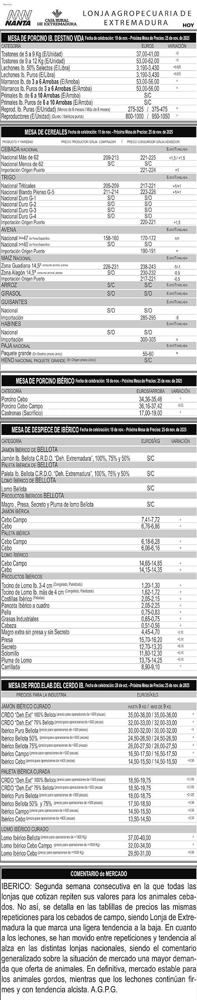 Consulte toda la información de las mesas de la lonja agropecuaria de Extremadura del jueves, 20 de noviembre de 2025.