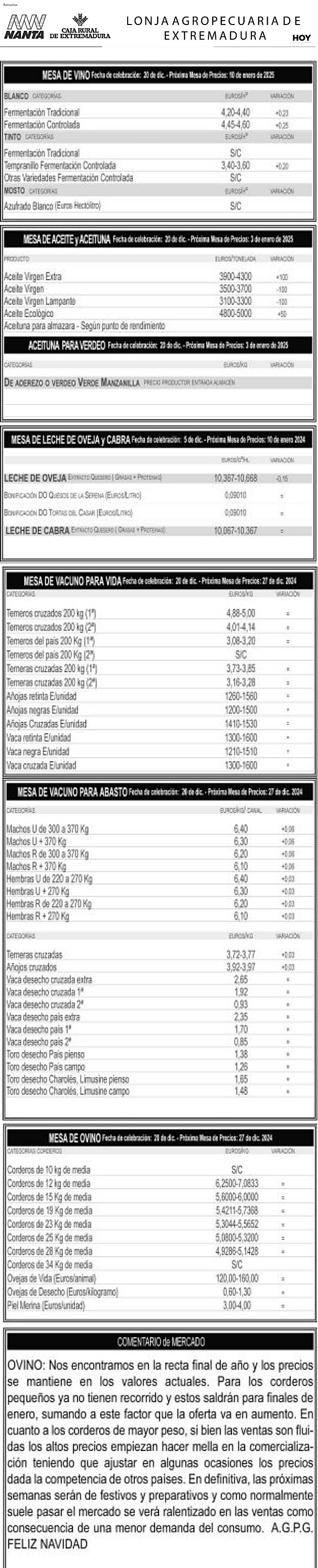Consulte toda la información de las mesas de la lonja agropecuaria de Extremadura del martes, 24 de diciembre de 2024.