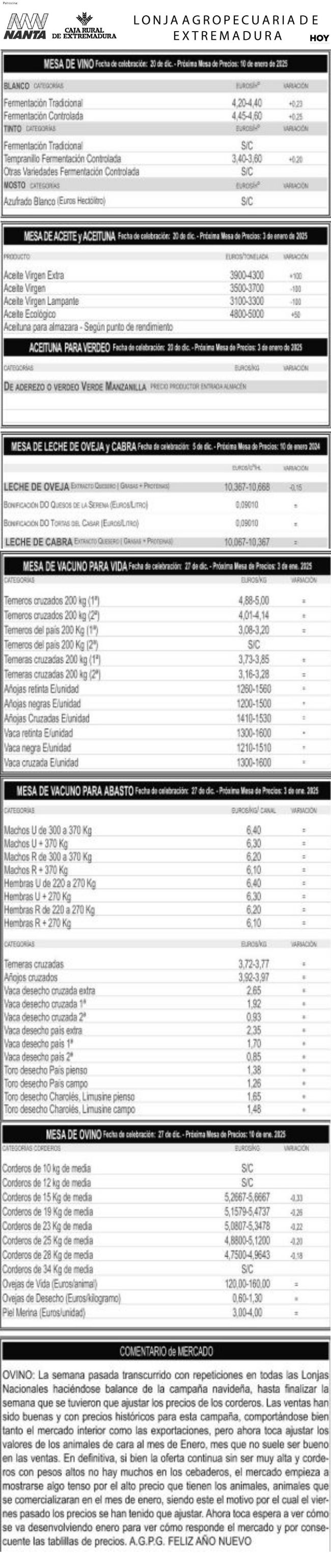 Consulte toda la información de las mesas de la lonja agropecuaria de Extremadura del martes, 31 de diciembre de 2024.
