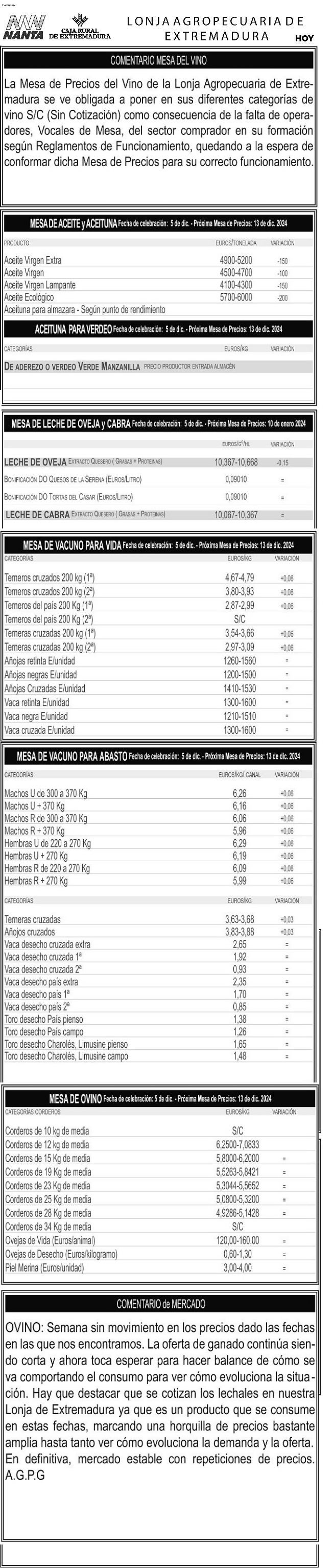 Consulte toda la información de las mesas de la lonja agropecuaria de Extremadura del martes, 10 de diciembre de 2024.