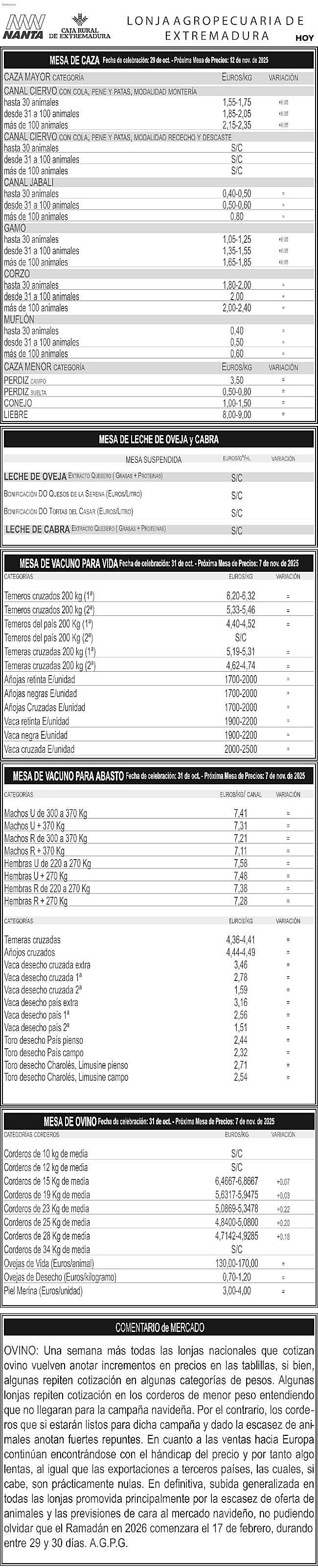 Consulte toda la información de las mesas de la lonja agropecuaria de Extremadura del martes, 4 de noviembre de 2025.