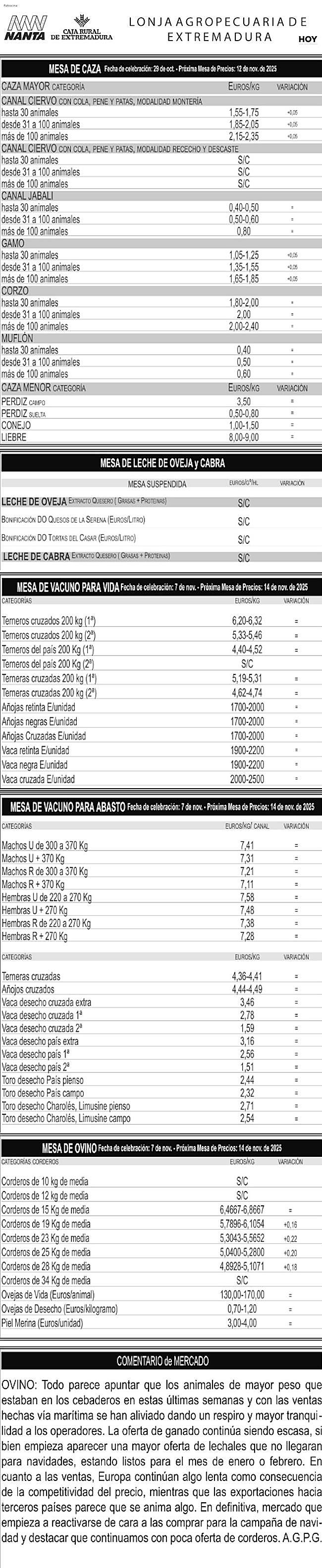 Consulte toda la información de las mesas de la lonja agropecuaria de Extremadura del martes, 11 de noviembre de 2025.