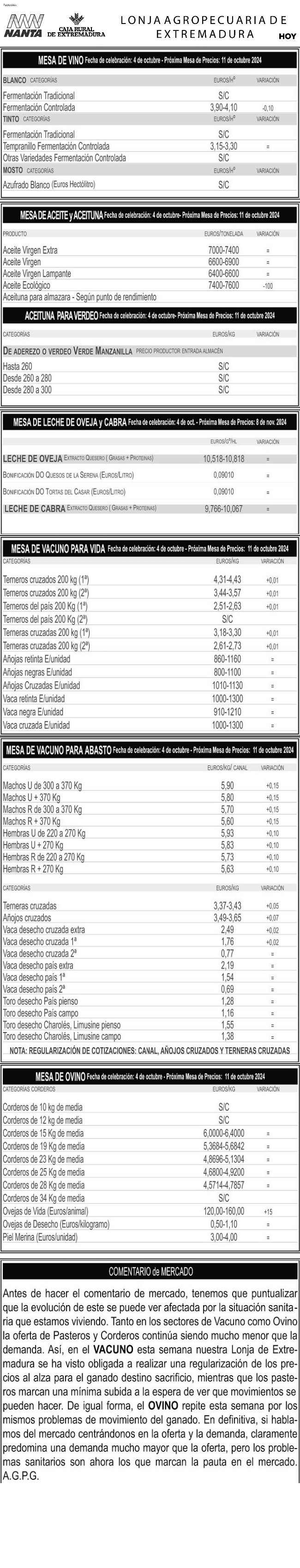 Consulte toda la información de las mesas de la lonja agropecuaria de Extremadura del martes 8 de octubre de 2024.