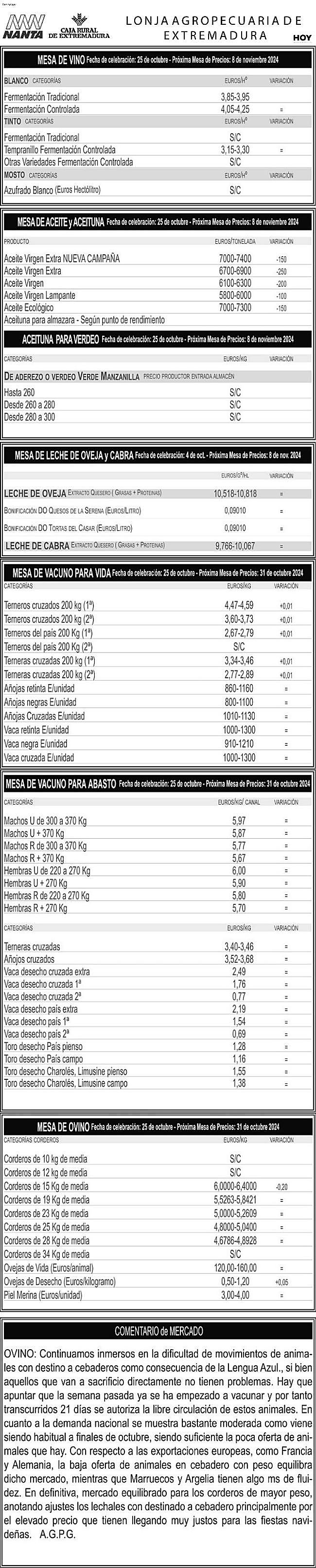 Consulte toda la información de las mesas de la lonja agropecuaria de Extremadura del martes, 29 de octubre de 2024.