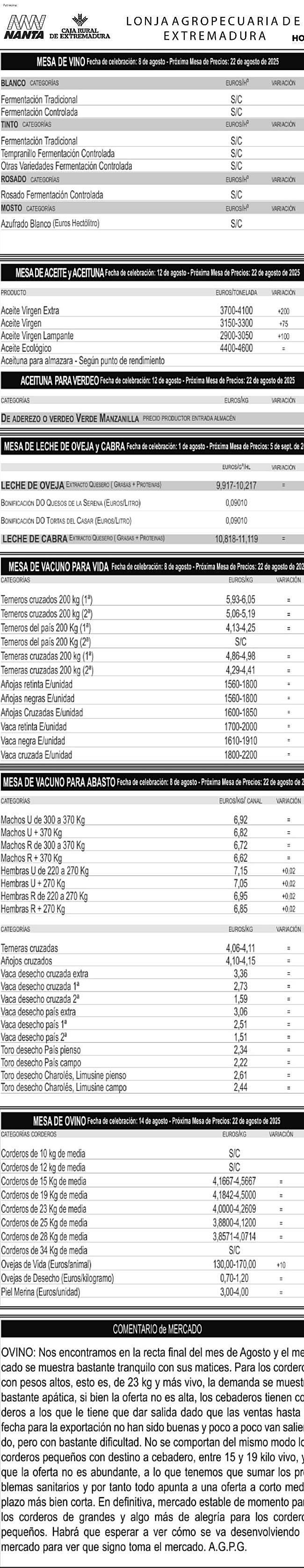Consulte toda la información de las mesas de la lonja agropecuaria de Extremadura del martes, 19 de agosto de 2025.