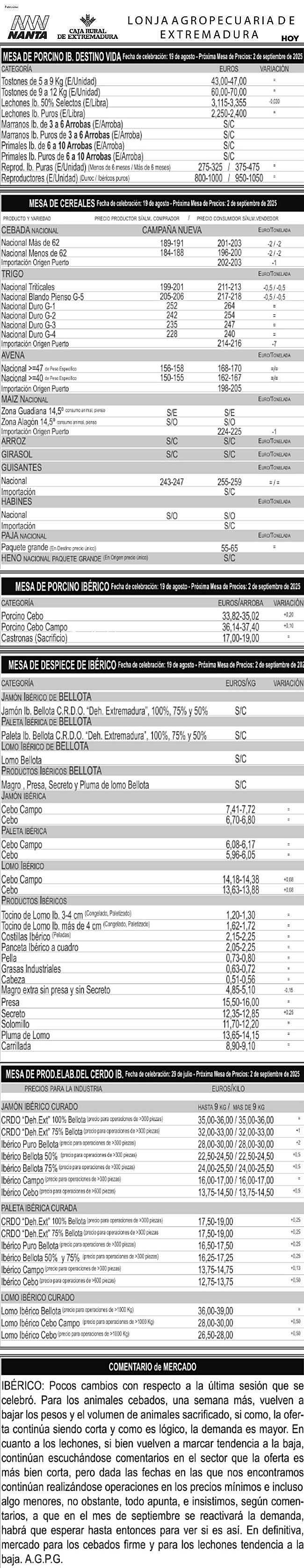 Consulte toda la información de las mesas de la lonja agropecuaria de Extremadura del jueves, 21 de agosto de 2025.