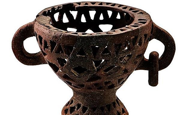 La copa calada fue localizado junto a una treintena de recipientes cerámicos en un espacio cultural, por eso se ha interpretado como objeto ritual en Castrejón de Capote, un poblado prerromano amurallado en Higuera de la Real de la II Edad del Hierro.