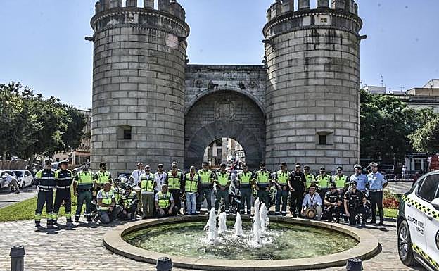 Diez minutos antes de la salida, los corredores se concentraron delante del arco para recibir el ánimo de los pacenses. Estuvieron franqueados por un amplio dispositivo de seguridad.