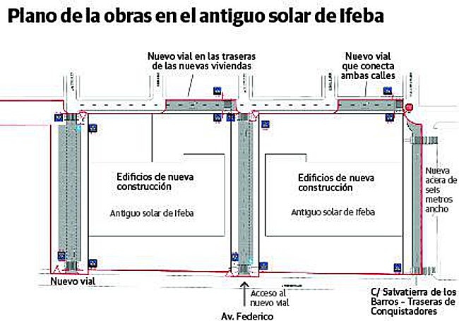 Estas obras se incluyen en la urbanización para la nueva promoción de viviendas que el grupo Edética levanta donde se ubicaba el viejo Ifeba. Las calles ya están terminadas y la promotora ha solicitado ya al Ayuntamiento que las asuma. Será un poco más adelante, en octubre, cuando planten los 40 árboles que darán sombra a los viales. Pero, de momento, las aceras están completas, las calzadas pintadas y las farolas colocadas.