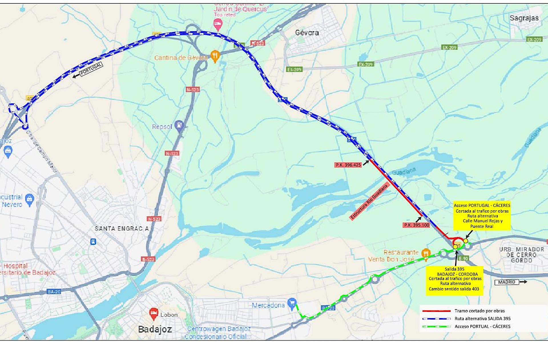 Por otra parte, se mantendrá el corte total de la calzada sentido Mérida/Madrid, entre los kilómetros 399,85 y 395,25. Esta medida obliga a los vehículos a desviarse por un carril de la calzada contraria. La incorporación hacia E90/A5 Mérida/Madrid en el enlace 400 (en la salida de la carreterá de Cáceres) se mantiene cerrada al tráfico. Para alcanzar este destino se habilitará una señalización indicando una ruta alternativa circulando en dirección Portugal y haciendo un cambio de sentido en la salida 403 (situada a la altura del polígono industrial El Nevero).