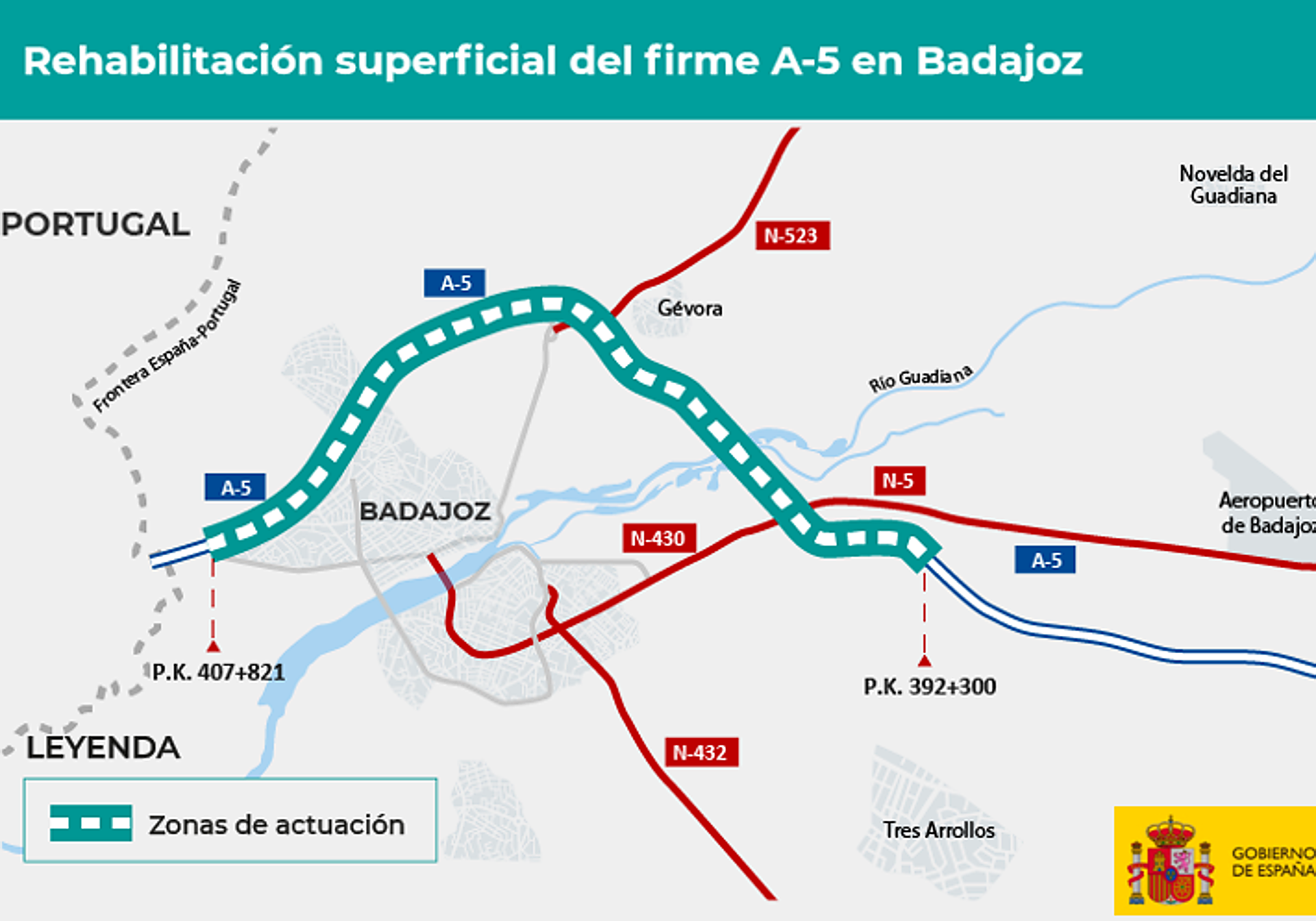 Estas obras se engloban en un proyecto de rehabilitación del firme de la autovía del suroeste A-5 mucho más amplio. La zona completa en la que se intervendrá contempla un total de 15 kilómetros, entre los kilómetros 392,300 y 407,821 en ambos sentidos, correspondiente al tramo entre Badajoz este y Badajoz oeste. El Ministerio de Transportes, Movilidad y Agenda Urbana ha destinado a esta actuación 14,3 millones de euros (IVA incluido). En concreto, el importe de las labores asciende a 14.275,901euros (IVA incluido).