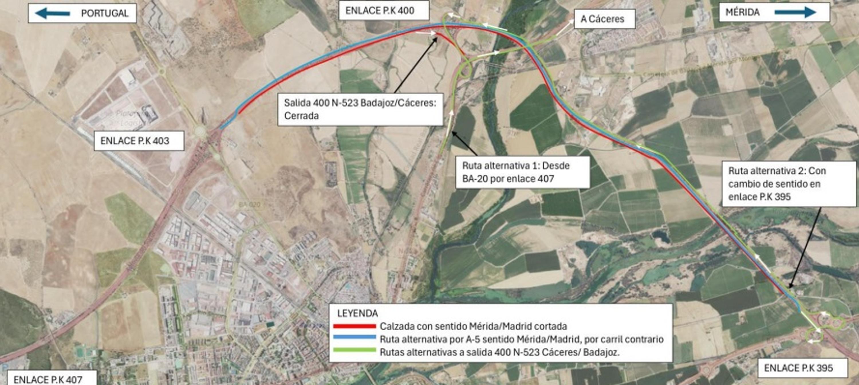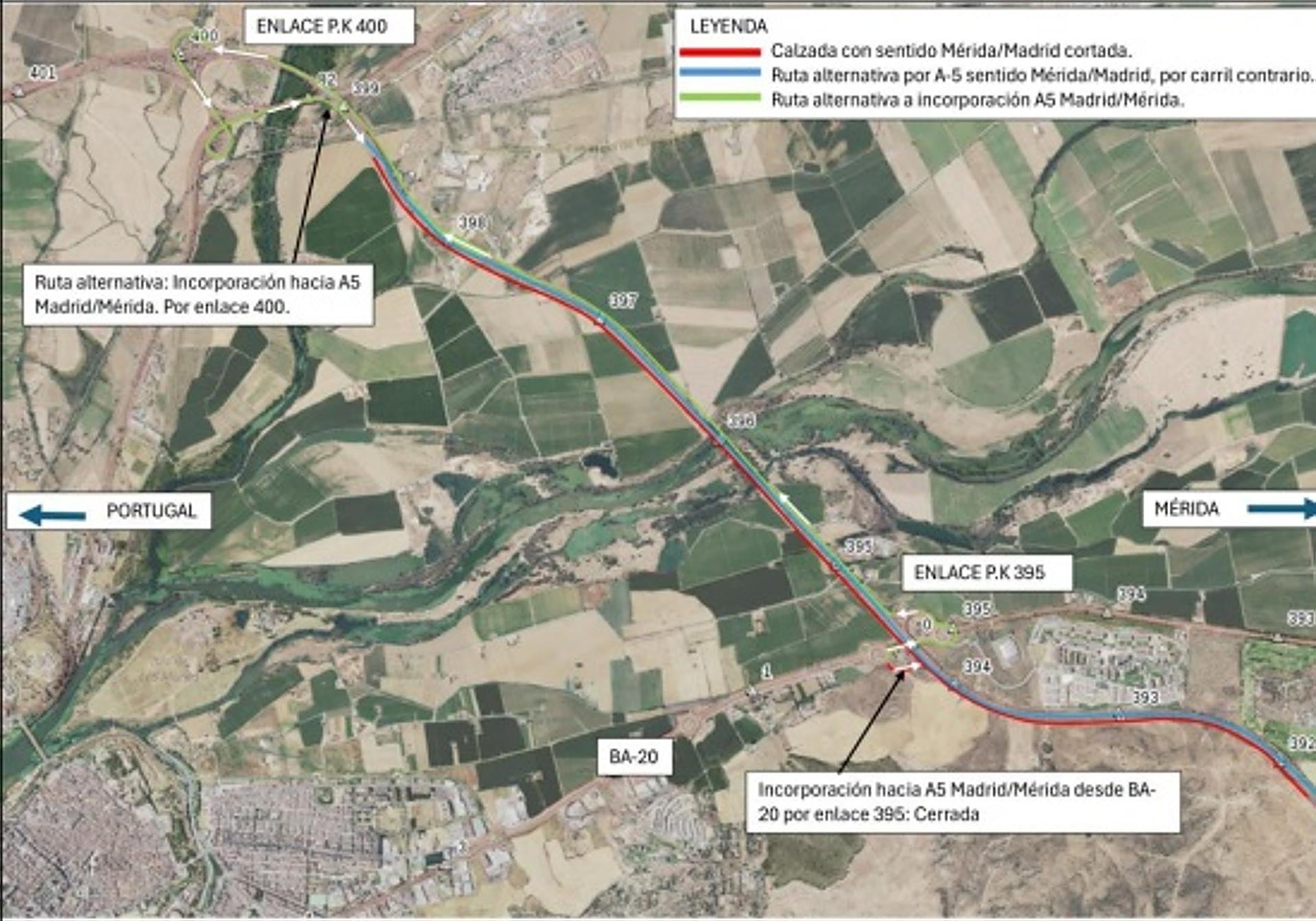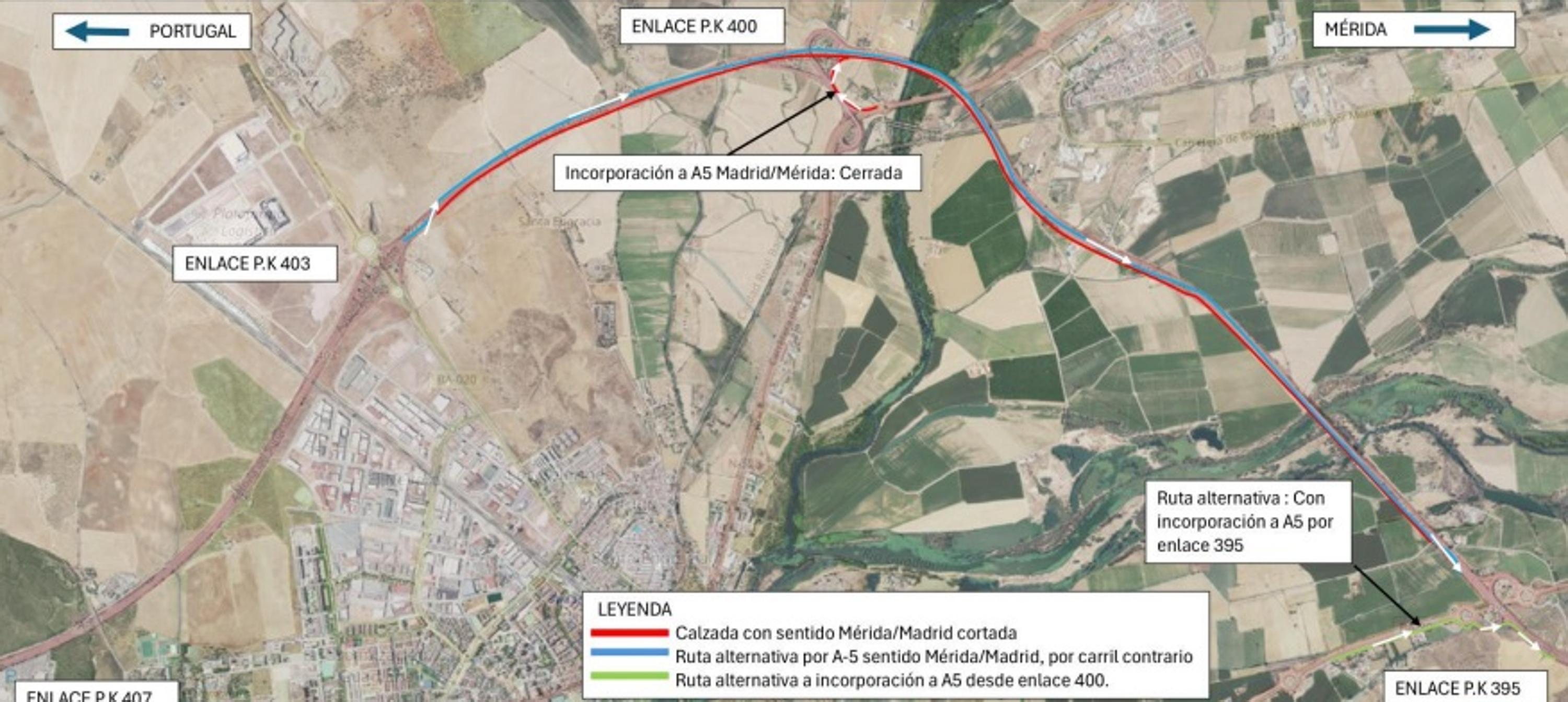 Además, se corta la autovía en sentido Portugal desde el kilómetro 407,2 al 407,8. Se cierra la incorporación a la A-5 en sentido Portugal. La alternativa propuesta es la antigua carretera hacia el país luso por la avenida de Elvas.