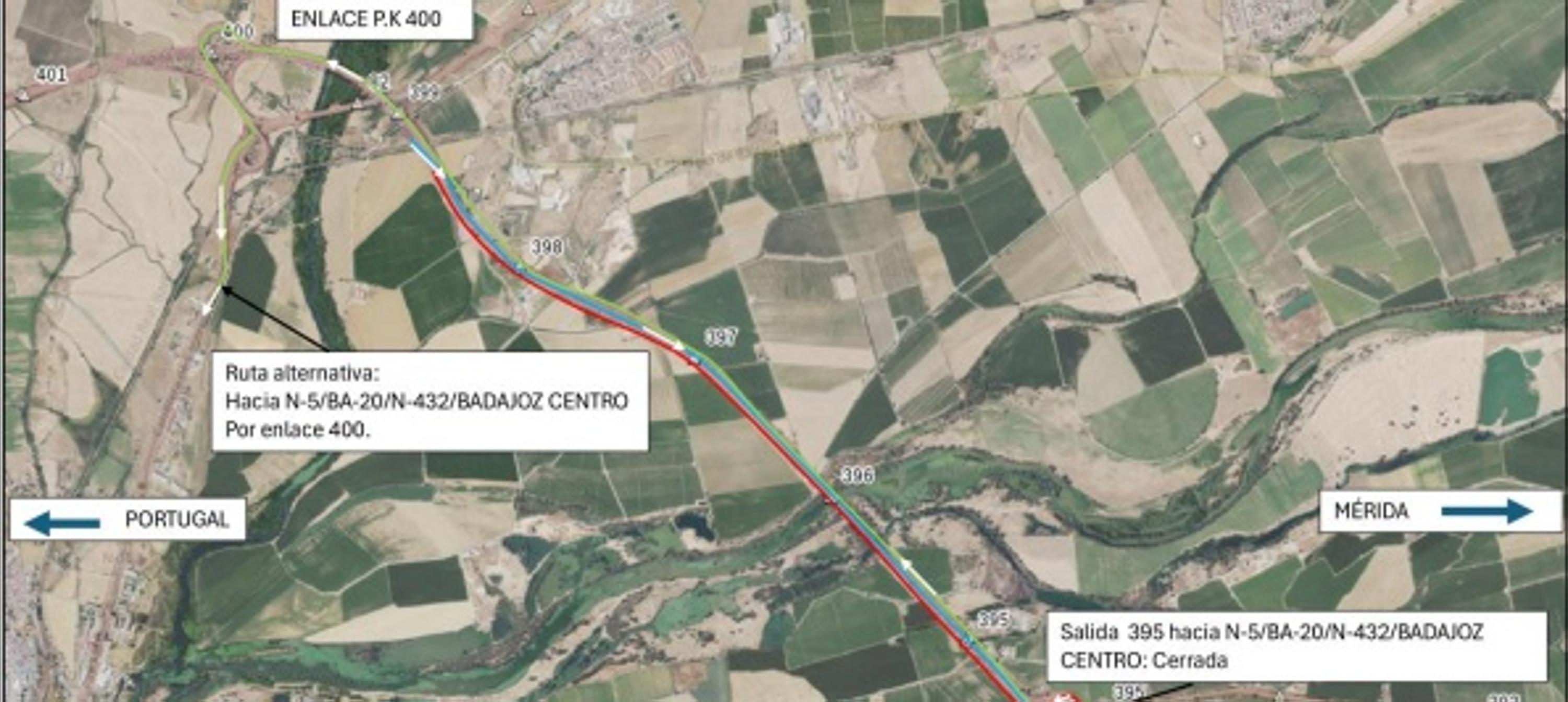 También se cierra en enlace 395. Para los destinos N-5, BA-20, Badajoz y N-432 Córdoba, la ruta alternativa es tomar dirección Portugal y salida en el enlace 400 para cambiar de sentido. El viernes, se abre al tráfico de nuevo este enlace.