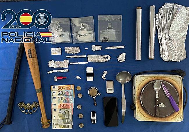 Los agentes incautaron 2,8 gramos de heroína, 2,3 gramos de cocaína, 2,8 gramos de hachís, pastillas de benzodiacepinas, y 12 dosis de estupefacientes preparadas para su consumo; una balanza de precisión y útiles para el suministro y distribución de estupefacientes.