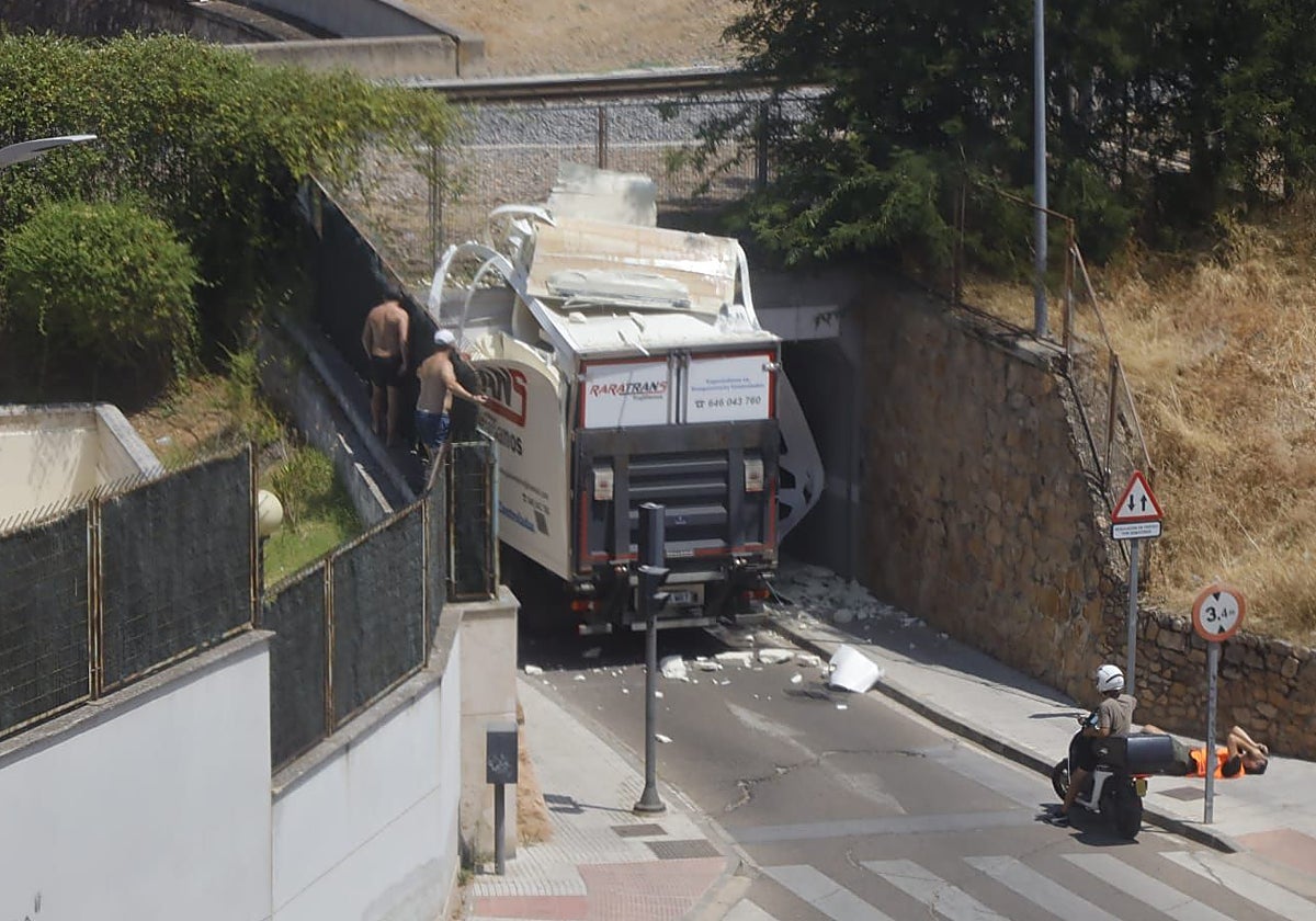 El vehículo ha sufrido daños considerables al quedar atrapado en el paso situado bajo las vías del tren que conecta las barriadas de San Fernando y el Gurugú. El conductor, de fuera de la ciudad, se disponía a atravesar el túnel que enlaza la avenida Argüello Carvajal con la calle Blas García Molina cuando, debido a las dimensiones del vehículo, ha quedado encajonado bajo la pasarela sin posibilidad de avanzar por sus propios medios, destrozando la caja del camión. Según indican fuentes municipales, el hombre no se ha percatado de la señal de limitación de altura.