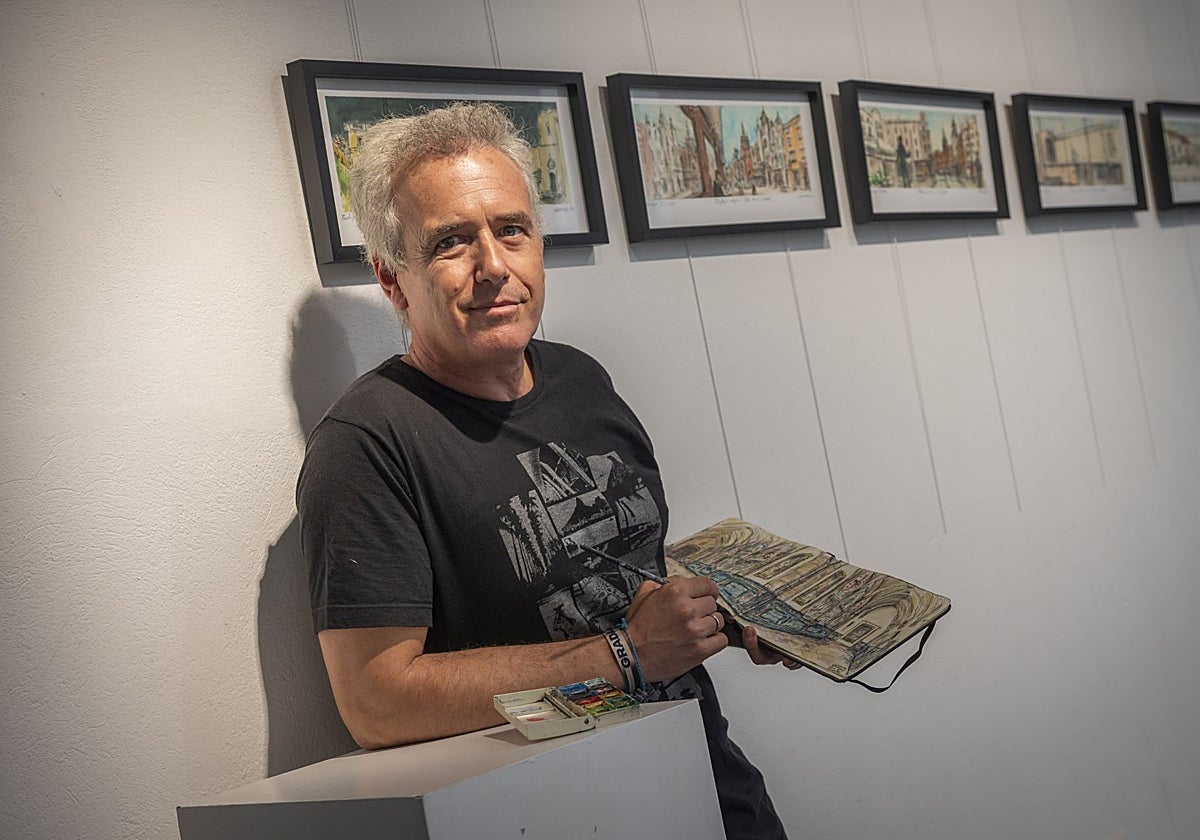 Gamero Gil (Oliva de la Frontera, 1975) se ha encargado de que gente de la ciudad en cuyo interior anidaba un deseo de pintar se ... ponga a ello, da igual que no haya cogido jamás un pincel o que sea profesional. Muchos pacenses lo han conocido por impulsar recientemente en Badajoz el movimiento Urban Sketchers, una idea global que pone a dibujar a varios grupos de aficionados un mismo rincón de una población. Además, Gamero Gil, de nombre José Manuel, tiene repartidas, solo por la capital pacense, varias obra de arte. Su firma está en los azulejos que hay en la calle Juan Carlos I, también es autor de la escultura a San Vicente de Paul en la plaza de Santo Domingo, del busto de Marín de Rodezno que mira al cielo desde una esquina de la Plaza Alta o del homenaje a los Donantes de Sangre que recientemente han cambiado de sitio para llevarlo a la avenida de Elvas, entre otras obras que le han ido encargando distintas instituciones, la última la figura del Padre Rafael.. Pero esta vez le toca mostrar su libreta más personal, la cual exhibe desde este martes en el Museo de la Ciudad Luis de Morales, donde el artista pacense presenta su 'Badajoz, cuaderno de artista', 106 páginas con 45 láminas que cualquier pacense reconocerá y que de paso han dado lugar a una exposición que durará hasta el día 2. El libro incluye en los páginas finales fotografías e información sobre cómo surgieron los dibujos.