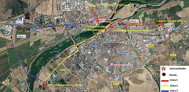 En este caso, las paradas estarían localizadas en el polígono de Ifeba, en el centro comercial El Faro, en el campus de la UEx, el Hospital Universitario, la Urbanización Guadiana, y en el polo hotelero del Casino de Badajoz.