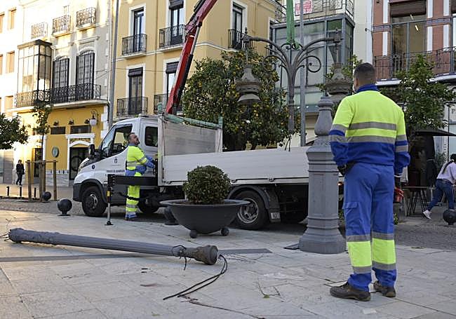 El incidente tuvo lugar sobre las dos de la madrugada, cuando los operarios colocaban el alumbrado navideño. Fue de hecho al tensionar uno de los cables que sujetan una de esas farolas lo que terminó por romperla y provocar ese efecto dominó en las luminarias que se encuentran en la plaza, a la altura de la cervecería Pepe Jerez.