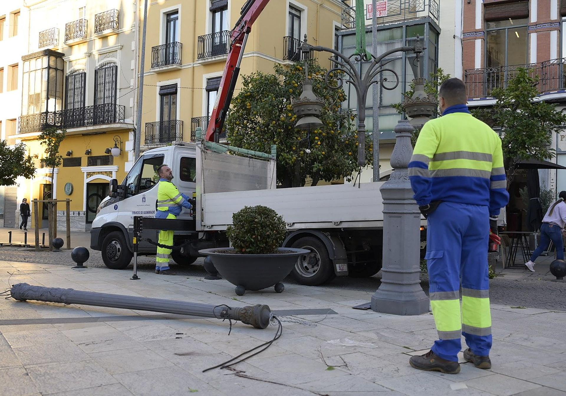 Las farolas rotas fueron trasladadas a dependencias municipales para repararlas y volver a unirlas a la mitad que ha quedado en pie, dado que son de fundición. Pero las características lámparas en forma de bola (dos por cada una de ellas) que han sufrido daños tardarán un poco más. Según el primer teniente de alcalde, Carlos Urueña, será necesario encargar las que puedan haberse deteriorado porque no hay stock.