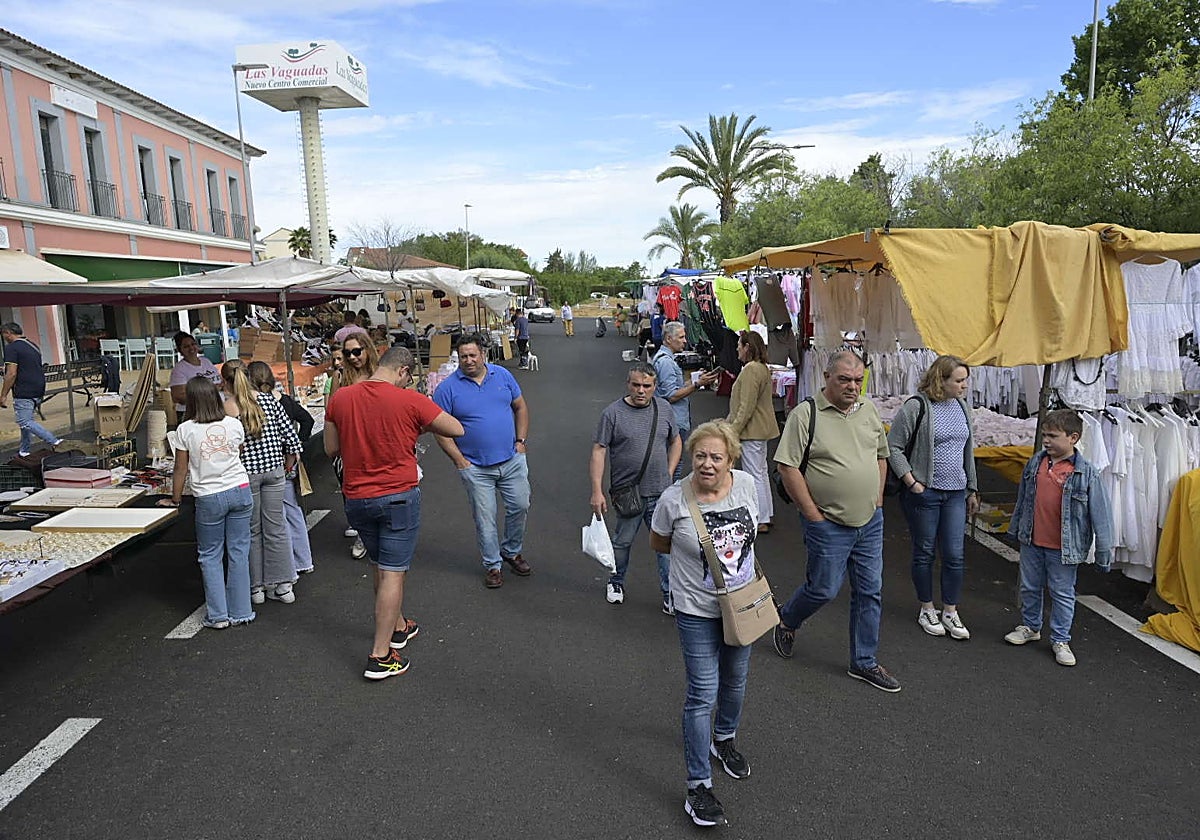El aparcamiento del centro comercial de Las Vaguadas estrenó este sábado un nuevo paisaje, el de los toldos de un mercadillo con sus artículos variados, ... los reclamos de 12 pares de calcetines a cinco euros, colchas, recipientes de barro, artículos de limpieza y ferretería,... Había de todo menos fruta y verdura porque así se acordó, para no entrar en competencia directa con los negocios cercanos, entre la Asociación de Vecinos que preside Guillermo Vilasán y la Asociación de Comerciantes Autónomos de Extremadura (Acaex), con Julián Cruz al frente.