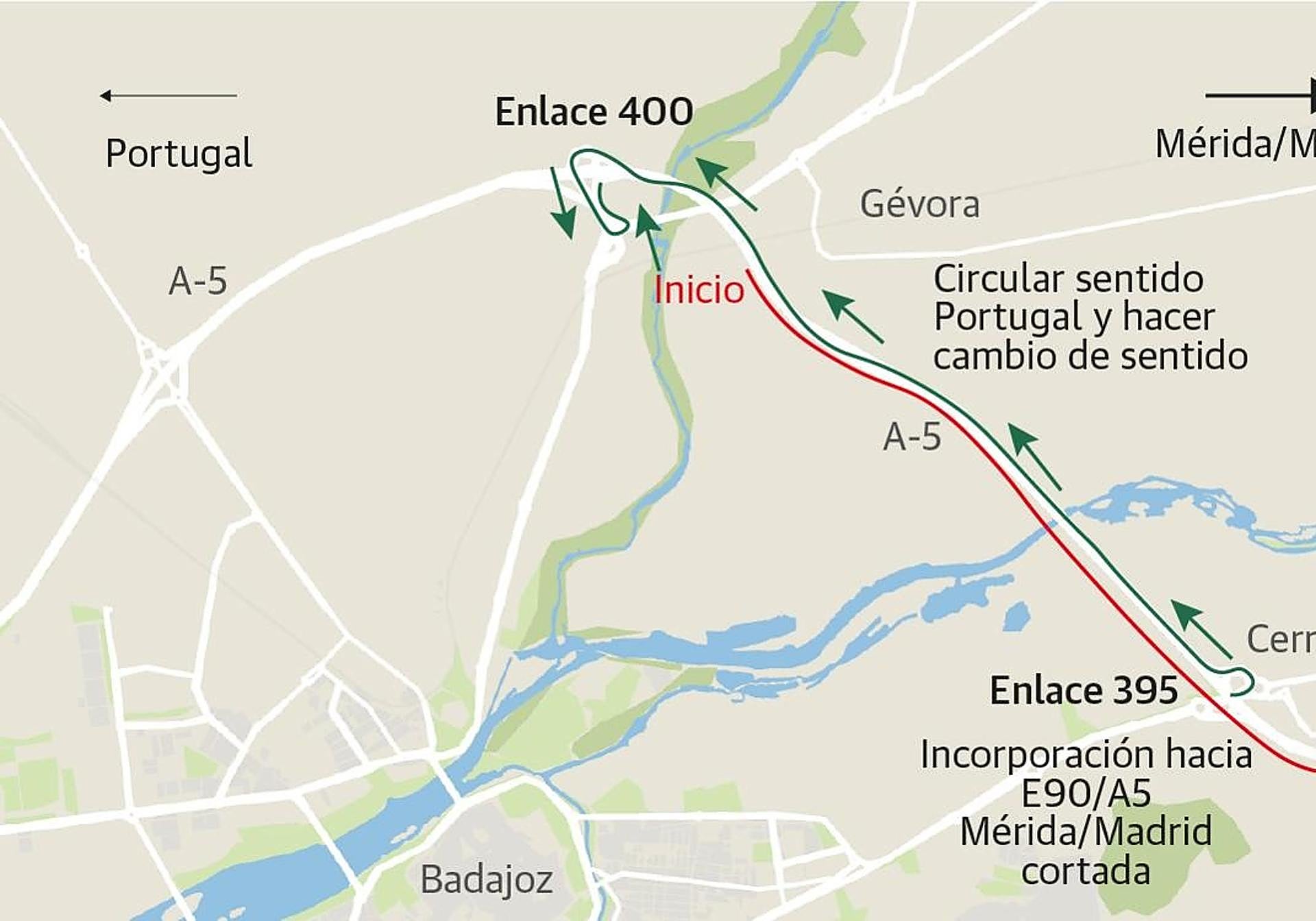 Hay que recordar que a estas afecciones de tráfico se suma el corte total de la calzada sentido Mérida/Madrid, entre los kilómetros 398,6 y 391,8 (el tramo de la autovía que se extiende desde Gévora hasta pasado Cerro Gordo), desviándose el tráfico por un carril de la calzada contraria. En este punto está cortada también la propia incorporación a la autovía por Cerro Gordo, el acceso desde la venta Don José. Para alcanzar este destino se indica como ruta alternativa la incorporación a la autovía circulando en sentido Portugal, haciendo posteriormente un cambio de sentido en la salida 400. En este punto se redirige el tráfico por la calzada contraria.