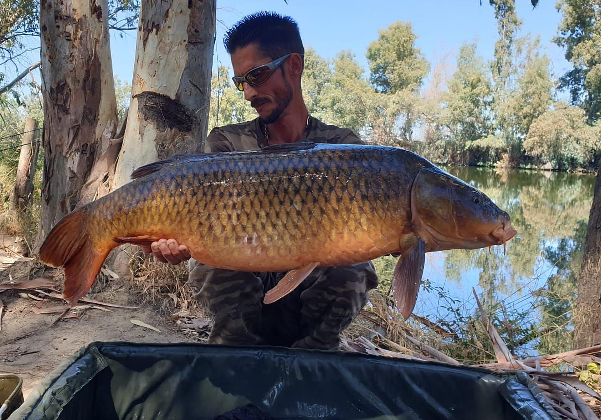 Raúl Aunión pesca una carpa de 37 kilos en el embalse de Orellana