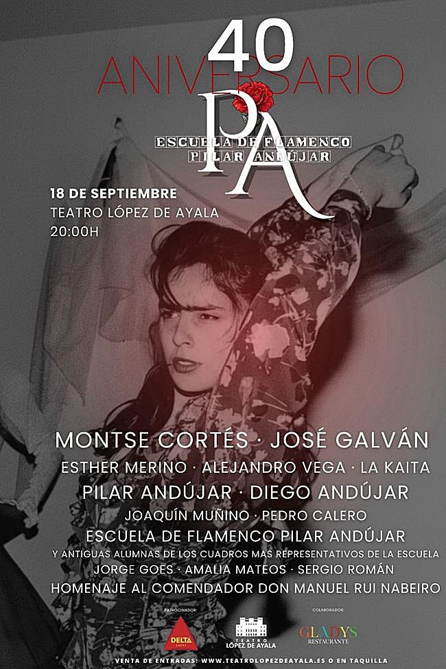 La escuela de flamenco de Pilar Andújar celebra su 40 aniversario con una gala que el próximo 18 de septiembre en el teatro López de Ayala a las 20.00 horas. Será un homenaje al baile, a su historia y al legado de Andújar. Entre otros, está previsto que actúen José Galván, y Pilar y Diego Andújar, y los cantaores Esther Merino, Alejandro Vega, La Kaíta y Montse Cortés. También estará el guitarrista Joaquín Muñino, el pianista Pedro Calero, y Amalia Mateos con su flauta travesera. Jorge Goes cantará fados y Sergio Román declamará poesía.