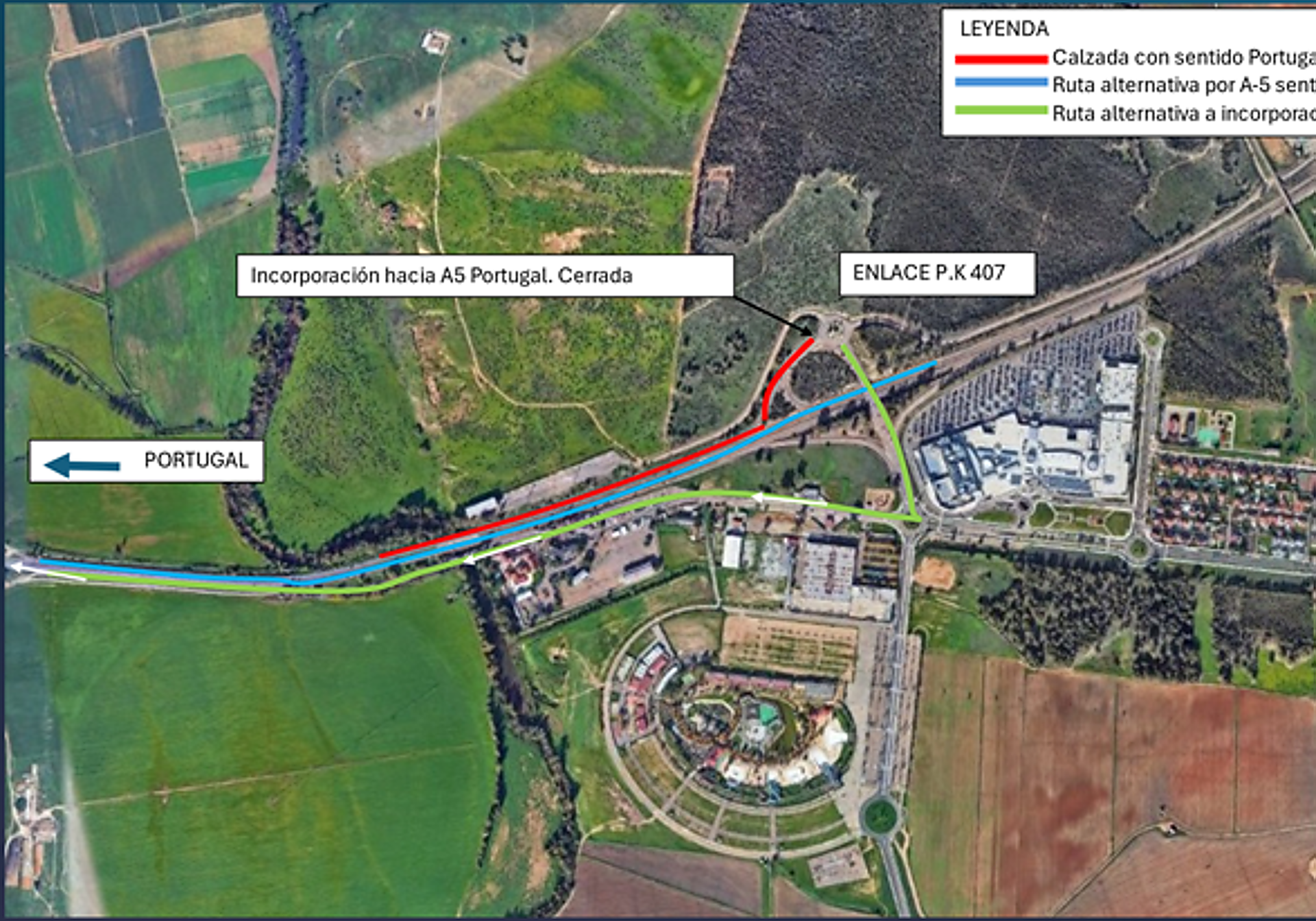 Además, durante esos cinco días, continúa el corte total de la calzada en sentido Portugal, entre los km 405,600 a 407,821. En ambos casos se desviará el tráfico por un carril de la calzada en sentido contrario (Madrid). Se proponen como rutas alternativas al cierre de la incorporación a la autovía en sentido Portugal desde el enlace 407, cortado. Una sería la avenida de Elvas, en la glorieta de El Faro e Ifeba, y otra utilizar el carril de la A-5 en sentido Mérida que se habilitará, con motivo de estas obras, para ir hacia la dirección opuesta.