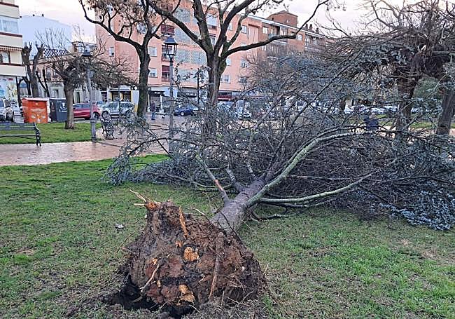 El temporal también derribó un árbol junto a una zona de juegos intantiles en la urbanización de Cuartón Cortijo.