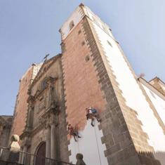 Uno de los cambios más llamativos en San Jorge ha sido la modificación del color de las torres de la iglesia, que han pasado de ser blancas a tener una tonalidad ocre. Ayer continuaron las labores de pintura, motivadas por cuestiones técnicas. El Obispado, titular del templo, explica que las torres volverán a recuperar su aspecto original cuando finalice el rodaje. Así aparece estipulado en el convenio firmado con la productora de la serie. Este cambio de color, se añade desde la Diócesis, ha sido supervisado por la Junta de Extremadura.