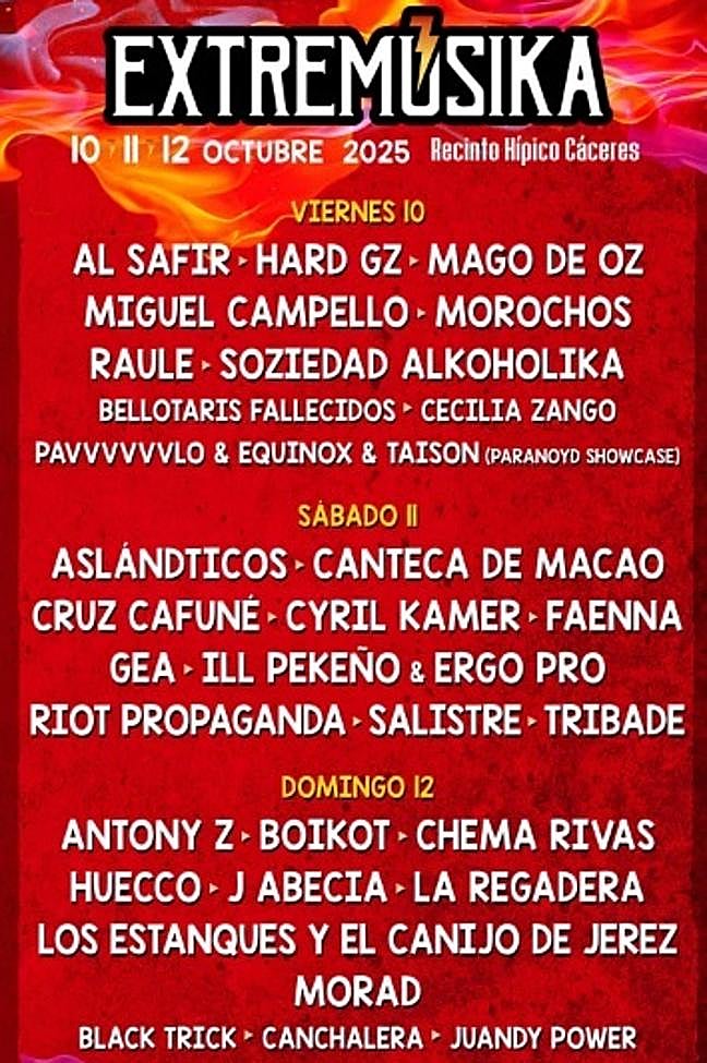 Los primeros nombres confirmados del Extremúsika 2025 se anunciaron a mediados de enero: el joven rapero Morad; Hard Gz, uno de los artistas más actuales dentro de la escena urbana; la banda catalana de rap Tribade; el jerezano Raule, que fusiona flamenco, pop y funk; y los cordobeses Aslandnticos.