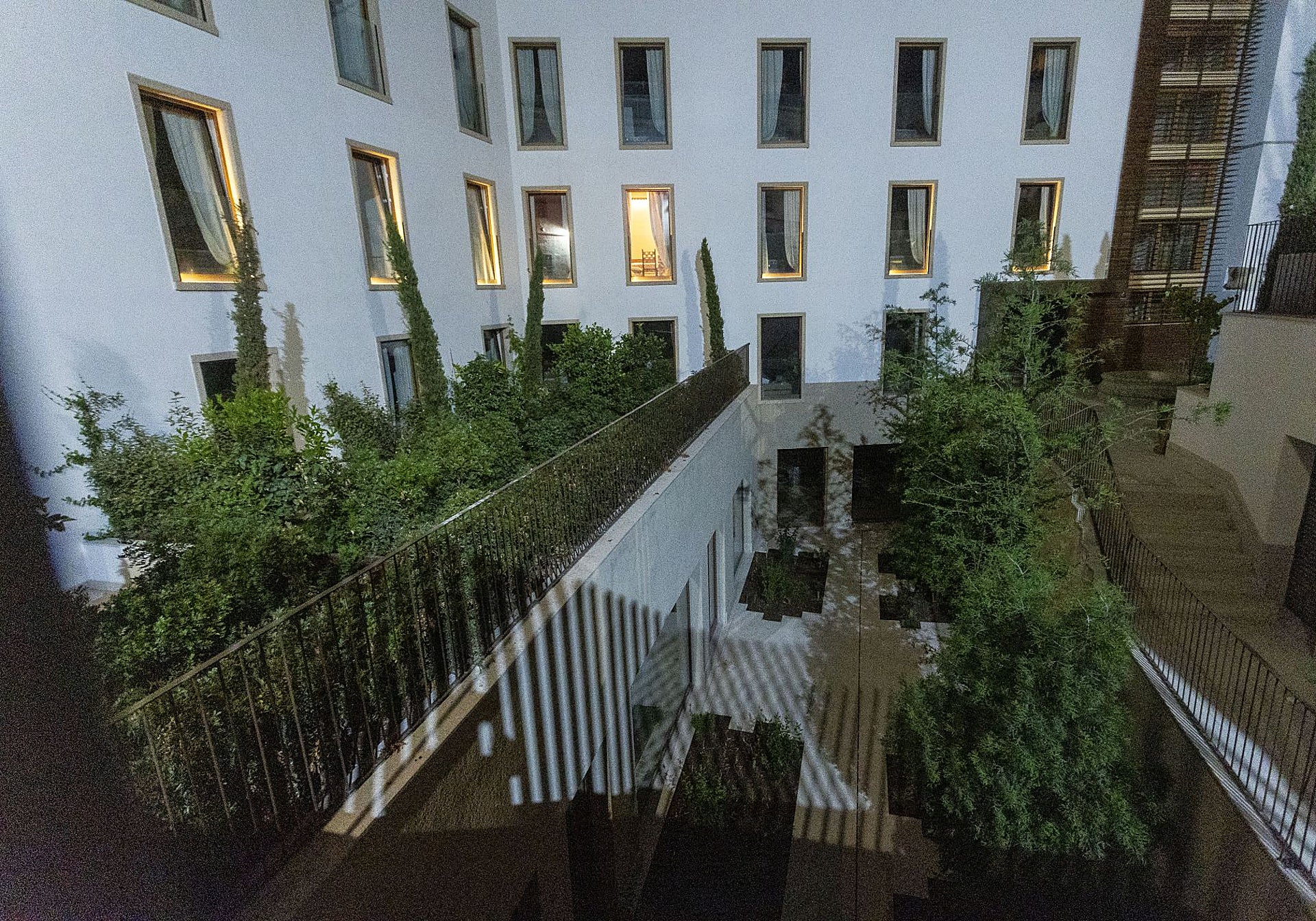 El jardín, uno de los grandes atractivos del recinto, deja ver su estética final desde la calle Zapatería, en las inmediaciones de la Plaza del Duque (Cuatro Esquinas). Será de acceso público y ha sido diseñado por Álvaro de la Rosa, uno de los grandes paisajistas del país. Por la noche, además, una parte de las ventanas de las habitaciones que dan a este recinto lucen iluminadas. El hotel cuenta con vigilancia privada.