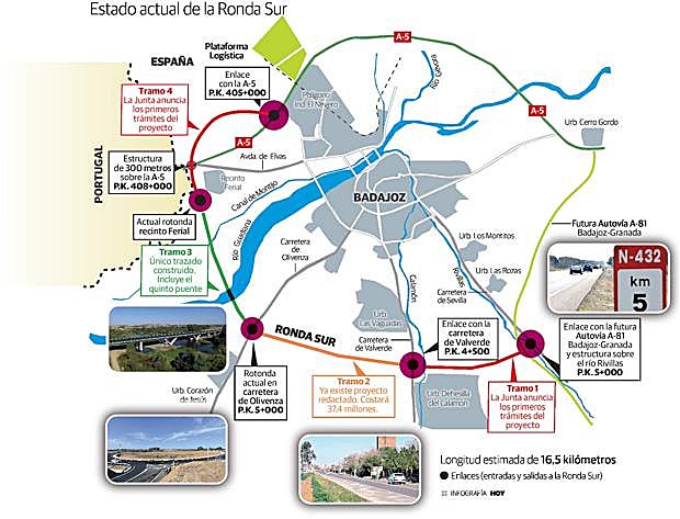 El pasado día 2 de diciembre el Diario Oficial de Extremadura (DOE) publicó la aprobación definitiva del proyecto de trazado de la ronda. Como ya informó HOY, se han recibido 10 alegaciones, seis de distintas administraciones y otras cuatro de particulares. El Ayuntamiento ha advertido de que hay discrepancias en una vía diseñada para 70 kilómetros por hora pero en la que solo se podrá circular a 50. La Junta aclara que la velocidad límite serán 50 kilómetros por hora. A su vez, el Consistorio ha solicitado un recorrido peatonal completo en la glorieta que conecta con la N-630 en el ferial.