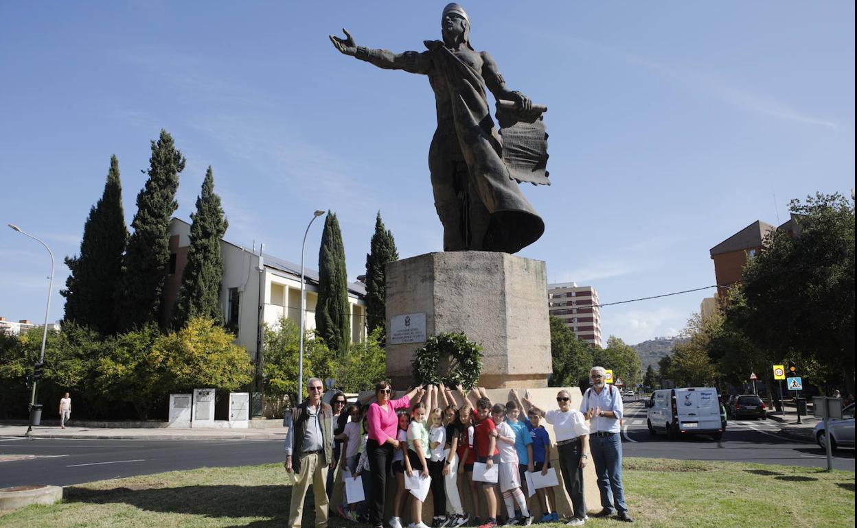 Desde hace 30 años la imagen del rey poeta está en Cáceres, en una rotonda del barrio de Moctezuma. Es una imponente estatua de bronce de cinco metros de altura y 3.000 kilos de peso, a la que pasada la una de la tarde de este martes un centenar de alumnos de colegio Moctezuma han colocado una corona de laurel, después de que José María Corrales, profesor de la Facultad de Formación del Profesorado de la Universidad de Extremadura les hablara del rey poeta,