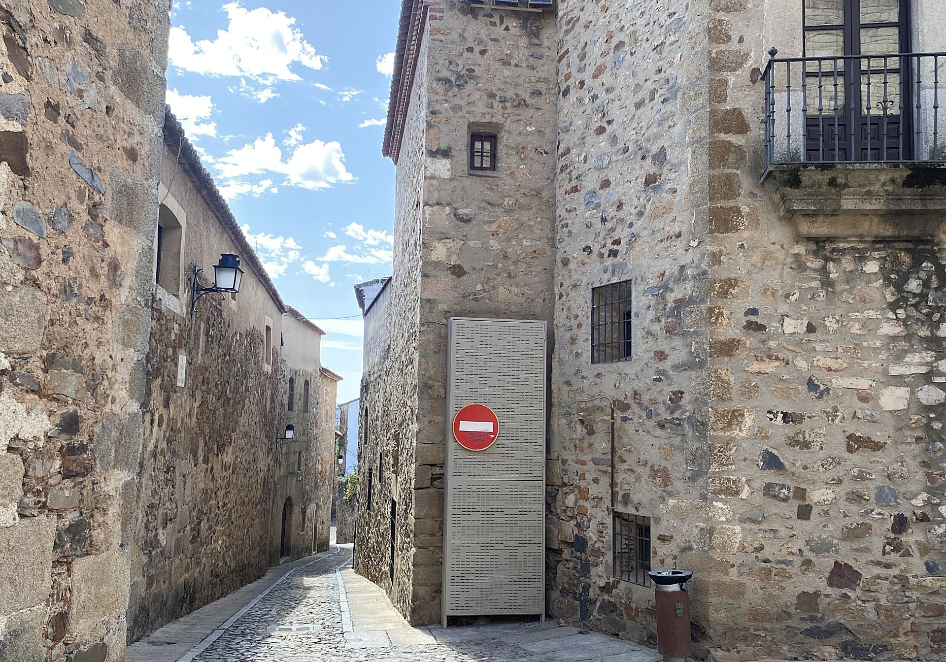 Hace tiempo que los turistas que descendían por la calle Alzapiernas no podían ver el cartel situado a la altura de la tapería Los Ibéricos ... que les dirige hacia la calle Paneras para llegar hasta la Plaza Mayor y la Ciudad Monumental de Cáceres. Se encontraba en muy mal estado.