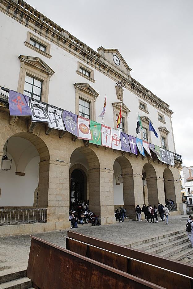 Cáceres se ha vestido oficialmente de Semana Santa. Desde ayer, coincidiendo con la fecha del pregón que marca la cuenta atrás para el arranque de la fiesta, la fachada del Ayuntamiento luce, como en años prepandemia, los pendones de las cofradías cacereñas, incluido el de la hermandad de Jesús Despojado, que debuta este año.