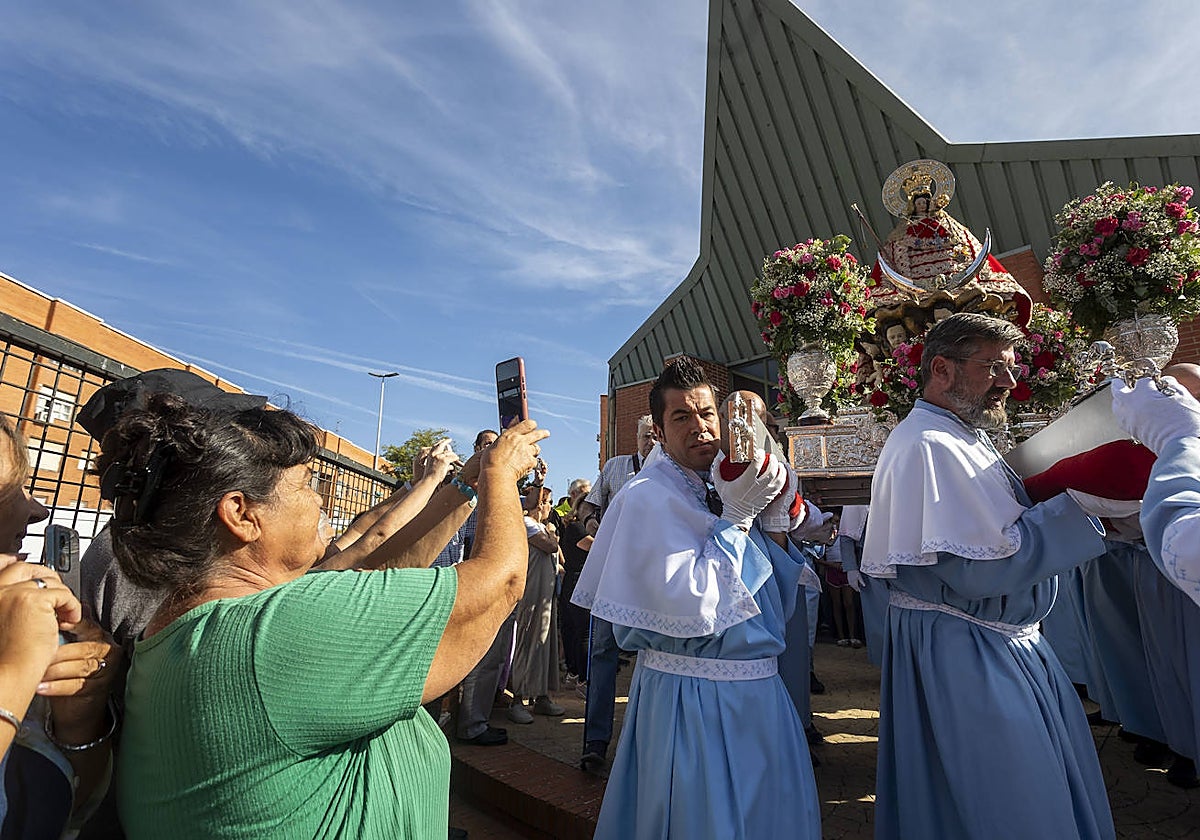 Momentos antes, María Cristina Cilleros se acercó a la imagen para hacerle una ofrenda floral. «Es una alegría impresionante tenerla aquí. No se puede explicar con palabras», resumía. «Para nosotros es un orgullo, una bendición y una satisfacción muy grande. Es la primera vez que la Virgen viene al barrio y la hemos acogido con mucho cariño», apuntaba con lágrimas en los ojos Guadalupe Mangas.