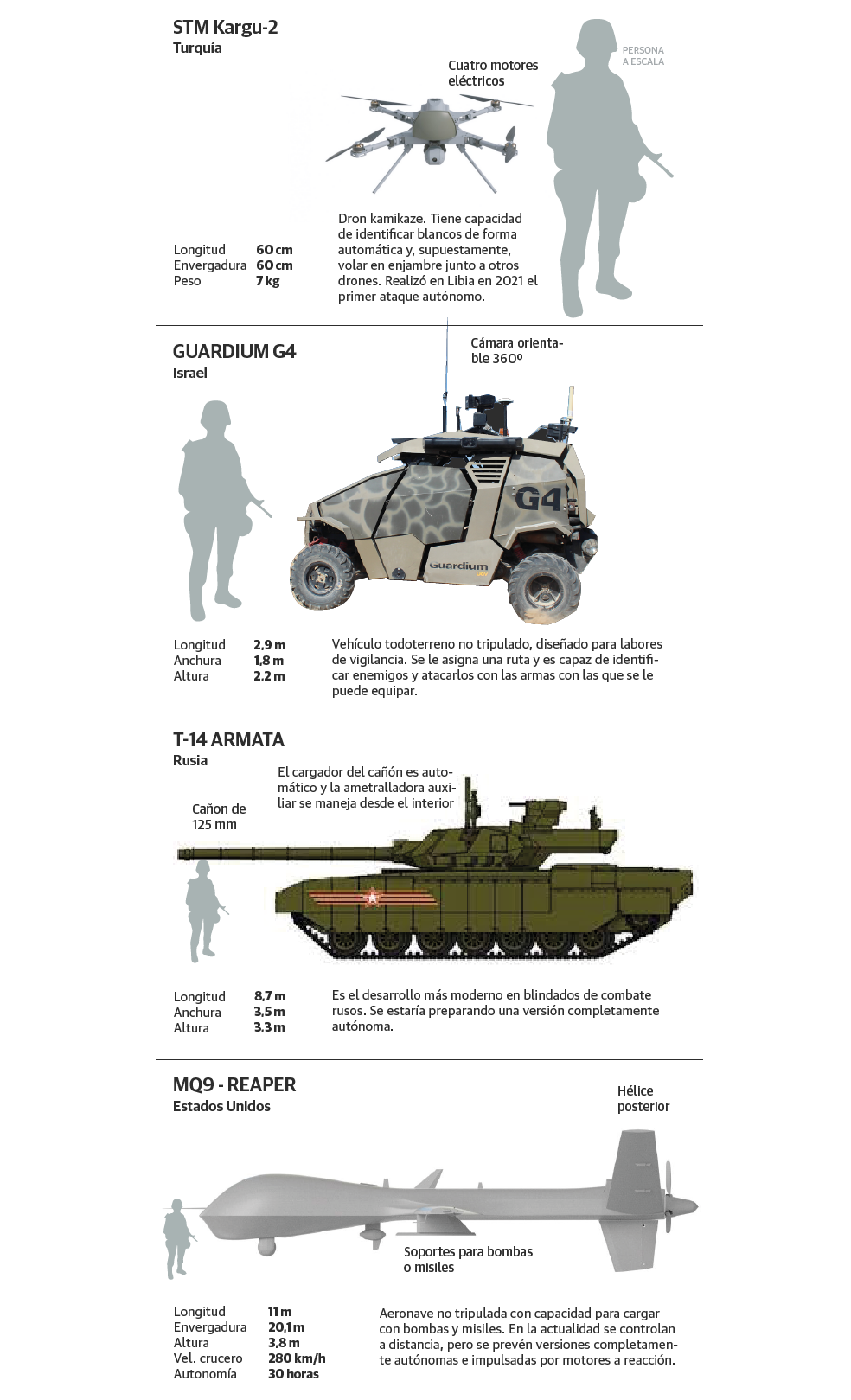 Un robot asesino puede adoptar muchas formas, incluso aspecto humanoide, pero lo más común es que sean drones. «Actualmente, Estados Unidos, Israel, Rusia y China son, junto con algunos países europeos, los grandes diseñadores y exportadores de drones militares a nivel mundial, pero se dispone de mucha menos información en el caso de los drones letales autónomos, al ser información clasificada por afectar a la seguridad nacional», explica Roser Martínez Quirante, profesora titular de la Universidad Autónoma de Barcelona, miembro del Comité Internacional por el Control de los Robots Armados (ICRAC) y coautora del libro 'Inteligencia artificial y armas letales autónomas' (Trea, 2018).
