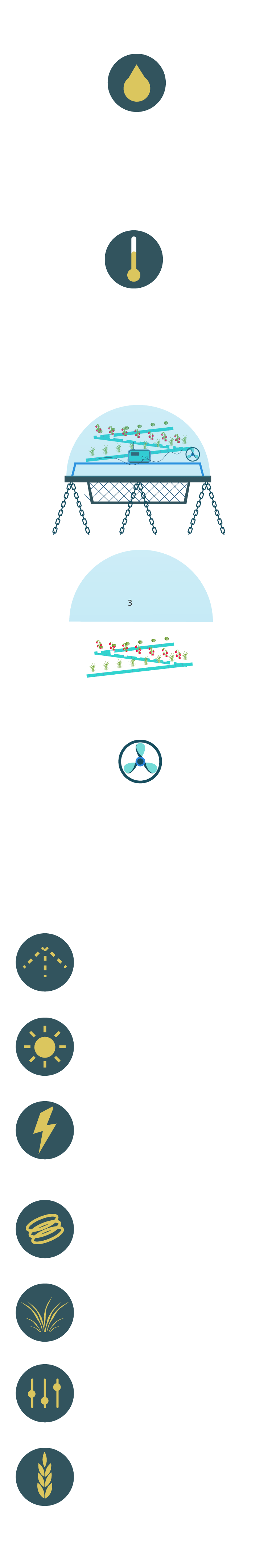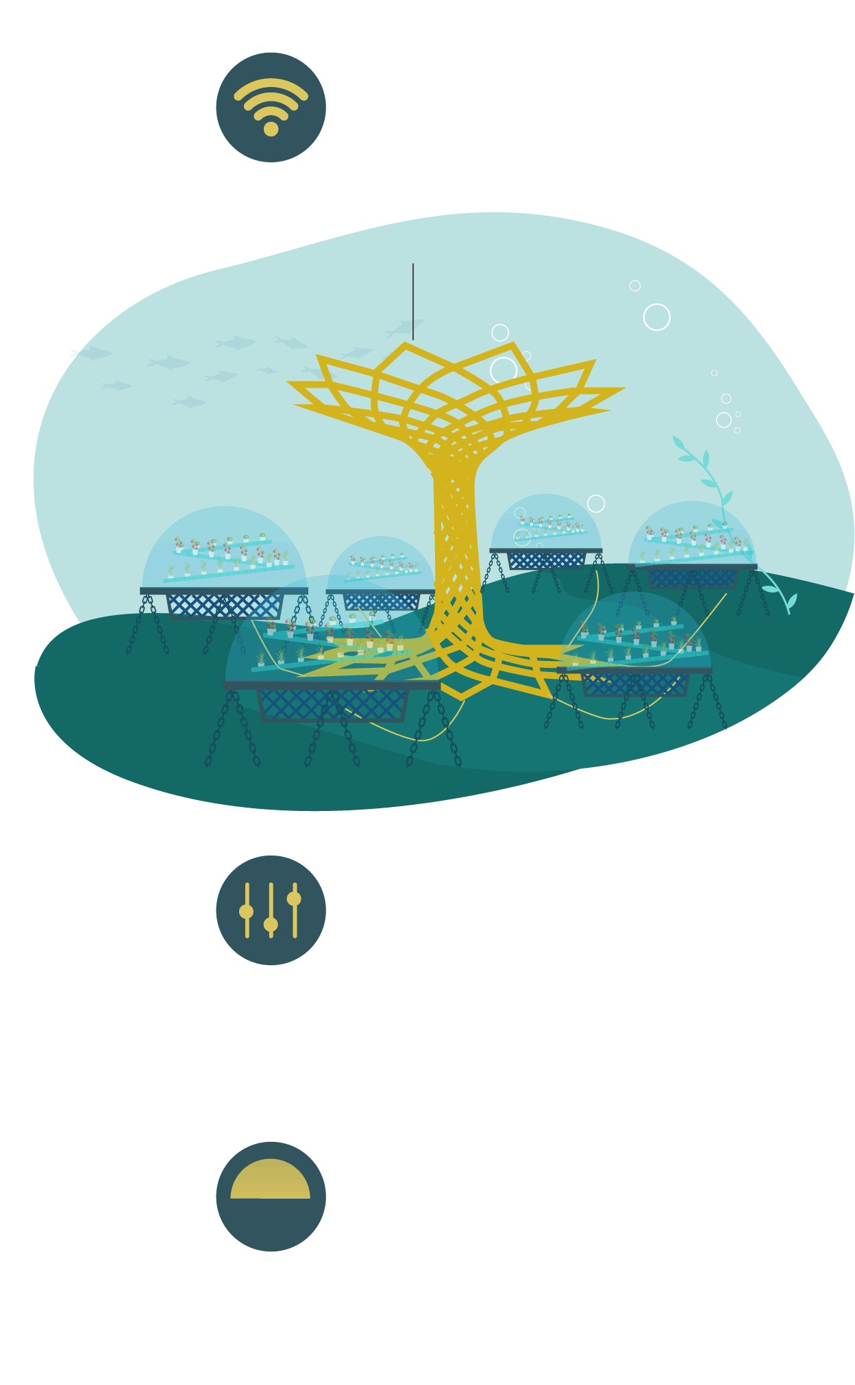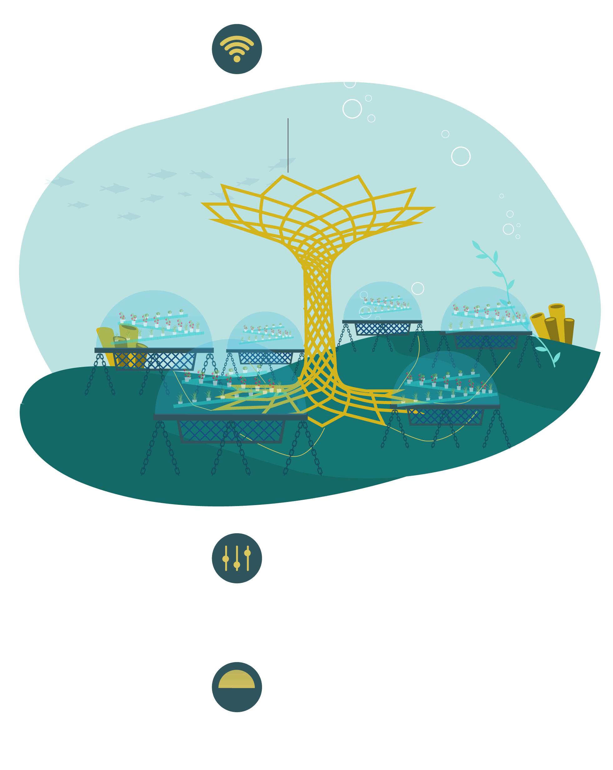 Los factores clave que permiten el crecimiento de las plantas son: la temperatura (del aire dentro de la biosfera y del agua de mar circundante), la iluminación y la humedad interior. La temperatura del aire dentro de las biosferas permanece estable entre los 24-32 °C en verano, con una variación de entre 3-4 °C entre el día y la noche. Dado que la temperatura dentro de las cápsulas es más alta que la del agua de mar, esta se evapora en el interior de las biosferas dando lugar a agua dulce.