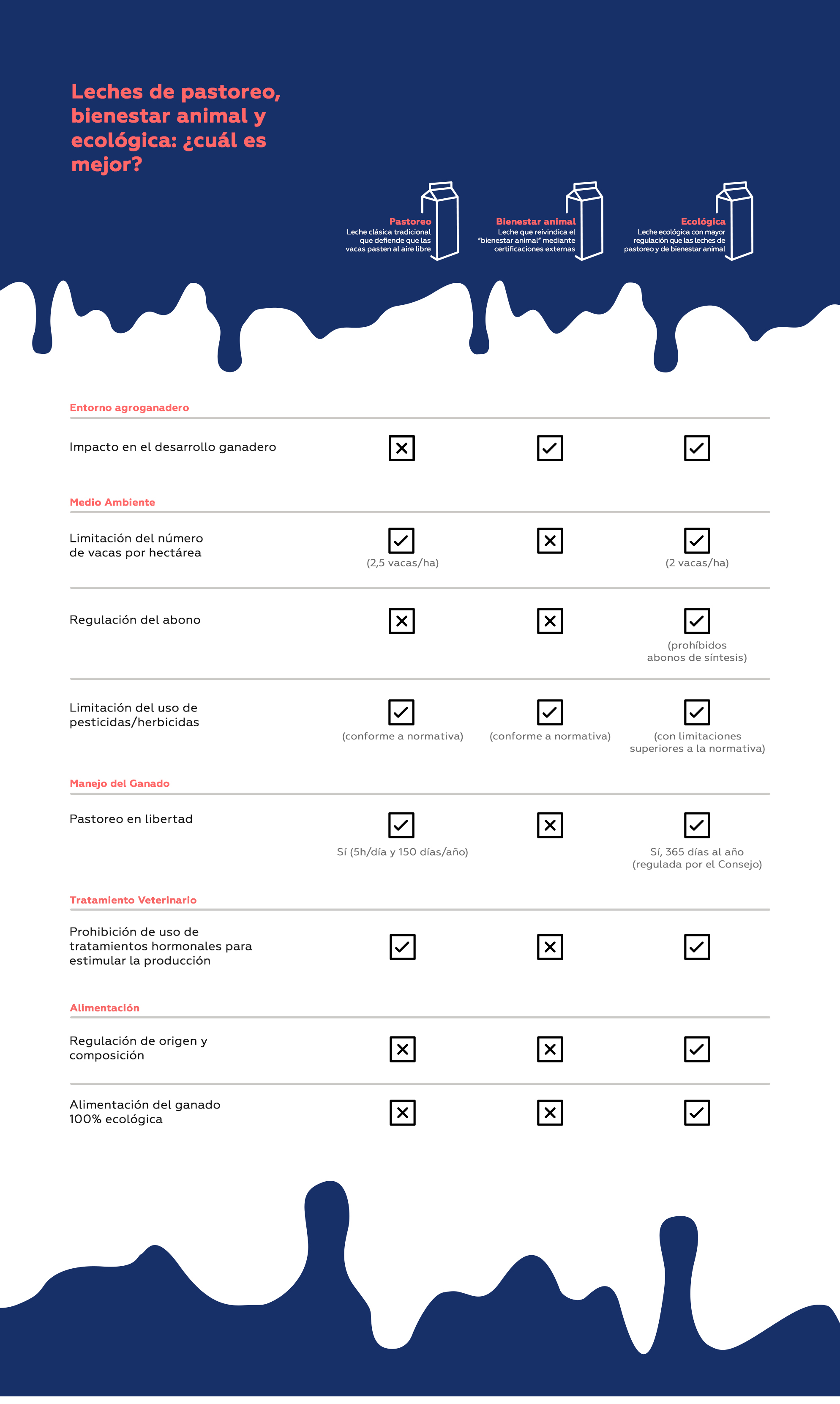 Frente a estas y otras medidas innovadoras, la leche de pastoreo y bienestar animal se limitan a seguir la normativa vigente para todos los fabricantes de leche, permitiendo en cada caso necesario el uso de antibióticos. Además, la acreditación y promoción de sus prácticas queda en manos de certificaciones privadas.