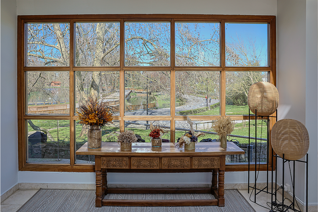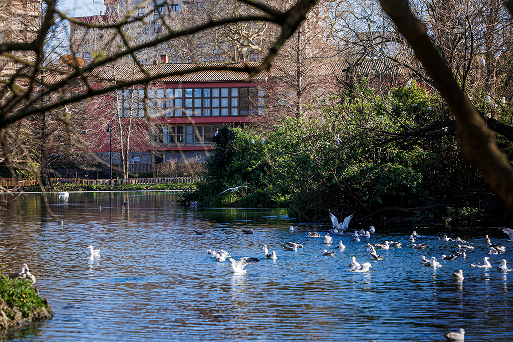 A principios de los 80 se amplía hasta las 40 habitaciones actuales. Y es aquí, y ahora, donde nos hallamos, sentados con Pilar Valdés en la galería y cafetería, un largo y ancho pasillo colmado de mesas, con un flanco cubierto por enormes cristaleras, ventanales que se abren al jardín que, a partir de la Semana Santa, se transforma en una de las terrazas más agradables de Gijón, cónclave de reunión para tomarse un café, disfrutar bajo sus árboles, su riachuelo, su puente, sus palmeras y al albur de la vegetación (y los vestigios del antiguo cauce) de un aperitivo, comer, tardear hasta las doce de la noche… Sí, ajenos al mundanal bullicio exterior. El otro extremo del Parador, digamos la parte de atrás, confluye en el inmenso Parque de Isabel la Católica, repleto de paseantes, diletantes del placer, un sosegado vergel colmado de estanques, pavos reales, cisnes, patos, 65 especies de plantas distintas, uno de los mayores parques urbanos de Asturias y considerado Bien de Interés Cultural. A este jardín miran las habitaciones superiores (todas las del Parador son dobles, excepto una individual), un lujo acariciado por la naturaleza.
