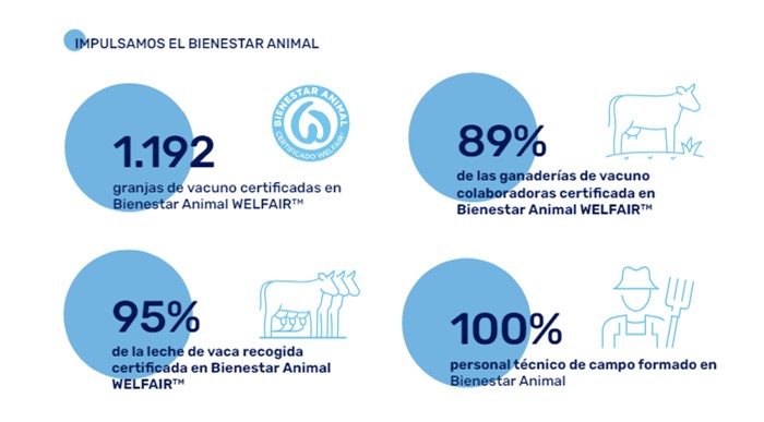 En la actualidad, Lactalis es la empresa láctea con más granjas en España certificadas en bienestar animal por AENOR. De hecho, el 89% de las ganaderÃas con las que colaboramos tienen certificación en Bienestar Animal Welfair, lo que representa el 95% de la leche recogida.