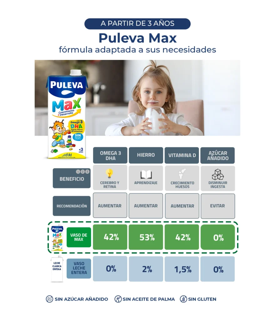 Puleva Max (a partir de los 36 meses): Formulada para niños a partir de los 36 meses, Puleva Max está enriquecida con Omega 3 DHA, hierro, calcio, 13 vitaminas y minerales como fósforo, magnesio y zinc. Esta leche de crecimiento favorece el desarrollo saludable de los niños y proporciona 24 veces más hierro que la leche de vaca.