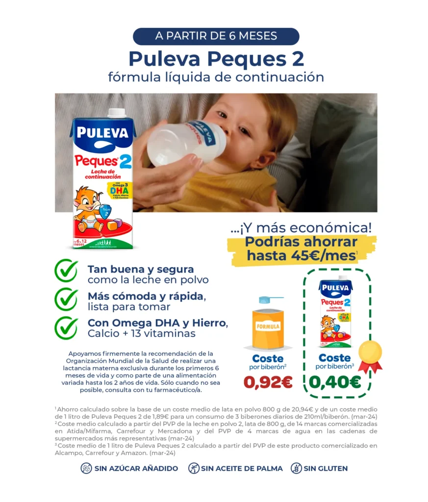 Puleva Peques 2 (a partir de los 6 meses): Esta fórmula está diseñada para bebés desde los seis meses de edad, proporcionando nutrientes como Omega 3 DHA y hierro, fundamentales para el desarrollo cerebral y físico. Es ideal como parte de una dieta progresivamente diversificada en la que se empiezan a introducir alimentos sólidos, garantizando que el bebé reciba los nutrientes necesarios en esta etapa clave de su crecimiento.