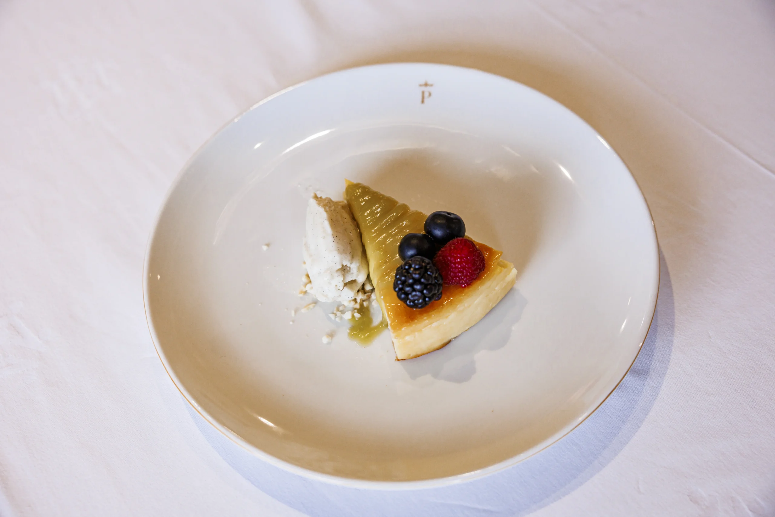 Es obligado dejar hueco para el postre. Ya sea para disfrutar del postre de las naranjas. Se trata de un postre que conmemoraba los 25 años del Parador y se ha quedado en la carta por méritos propios. Una base de crema de naranja bajo un bizcocho de naranja con helado de naranja y un muelle de caramelo. Si piensan que puede ser exceso de naranja, se equivocan, porque May consigue el punto perfecto entre la fuerza cítrica y el punto dulce que culmina una gran velada. La otra estrella de la sección dulce es la tarta de queso con mermelada de aguacate y helado.