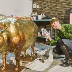 Escribano tuvo que modificar levemente su idea inicial a la hora de enfrentarse a la escultura. «Iba a ser con un pan de oro, pero era enorme y hemos utilizado una pintura de exteriores dorada, con un tratamiento de betún de Judea. He aplicado una multicapa mezclada con el betún y disolventes para darle otra textura», explica.